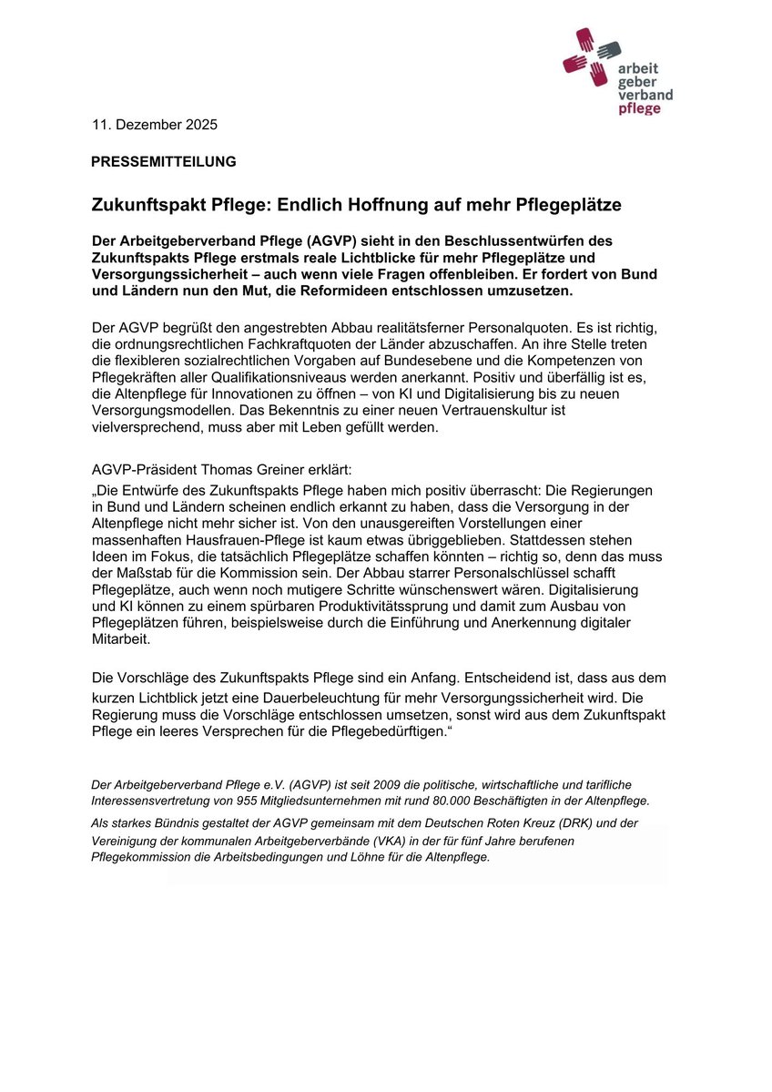 Der Arbeitgeberverband Pflege (AGVP) gratuliert Nina Warken und sieht in ihrer Nominierung die Chance auf den dringend benötigten pflegepolitischen Neuanfang….